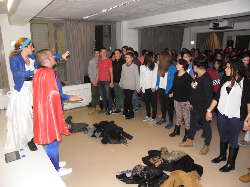 Kerman da. Gazteak reggaeton dantzatzen jarri dituzte eta tailerrak aurkeztu dizkiete bi aktoreek.