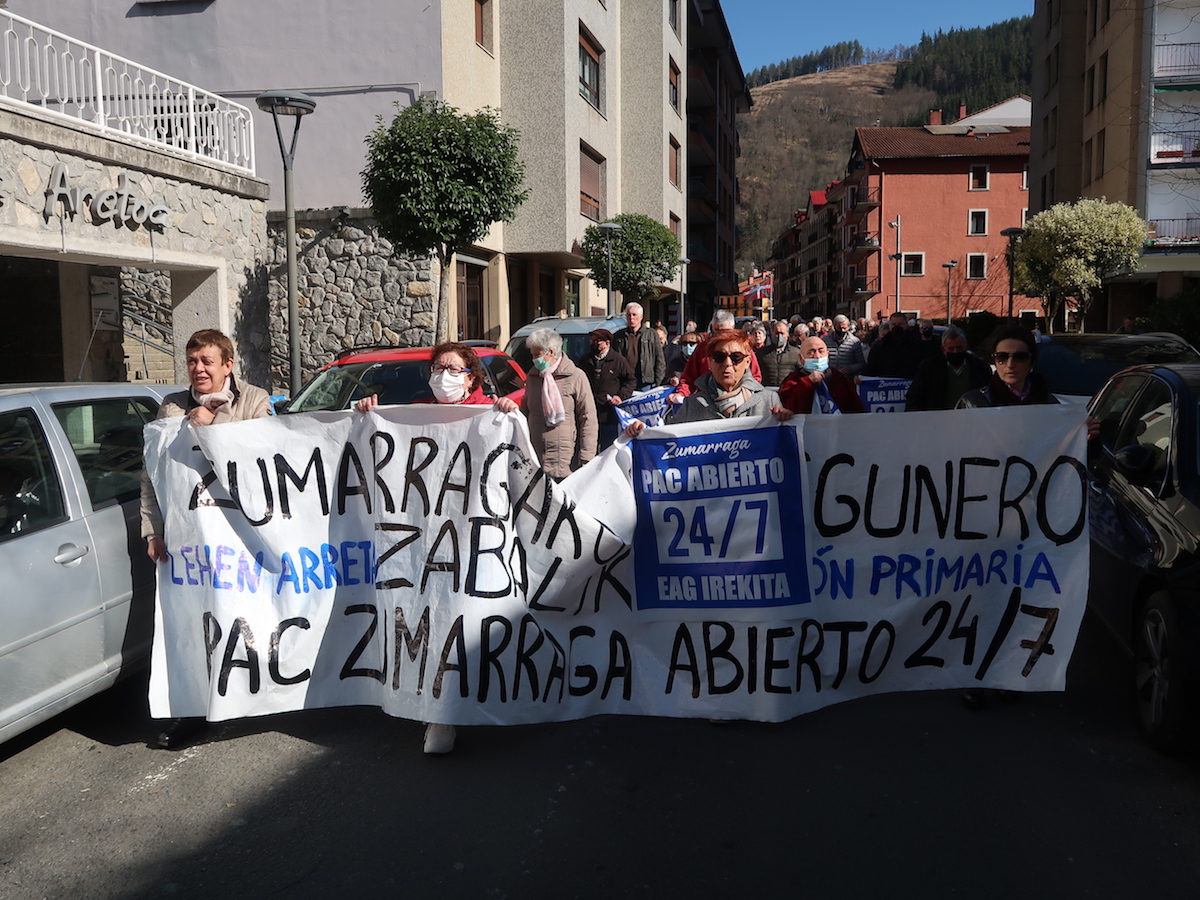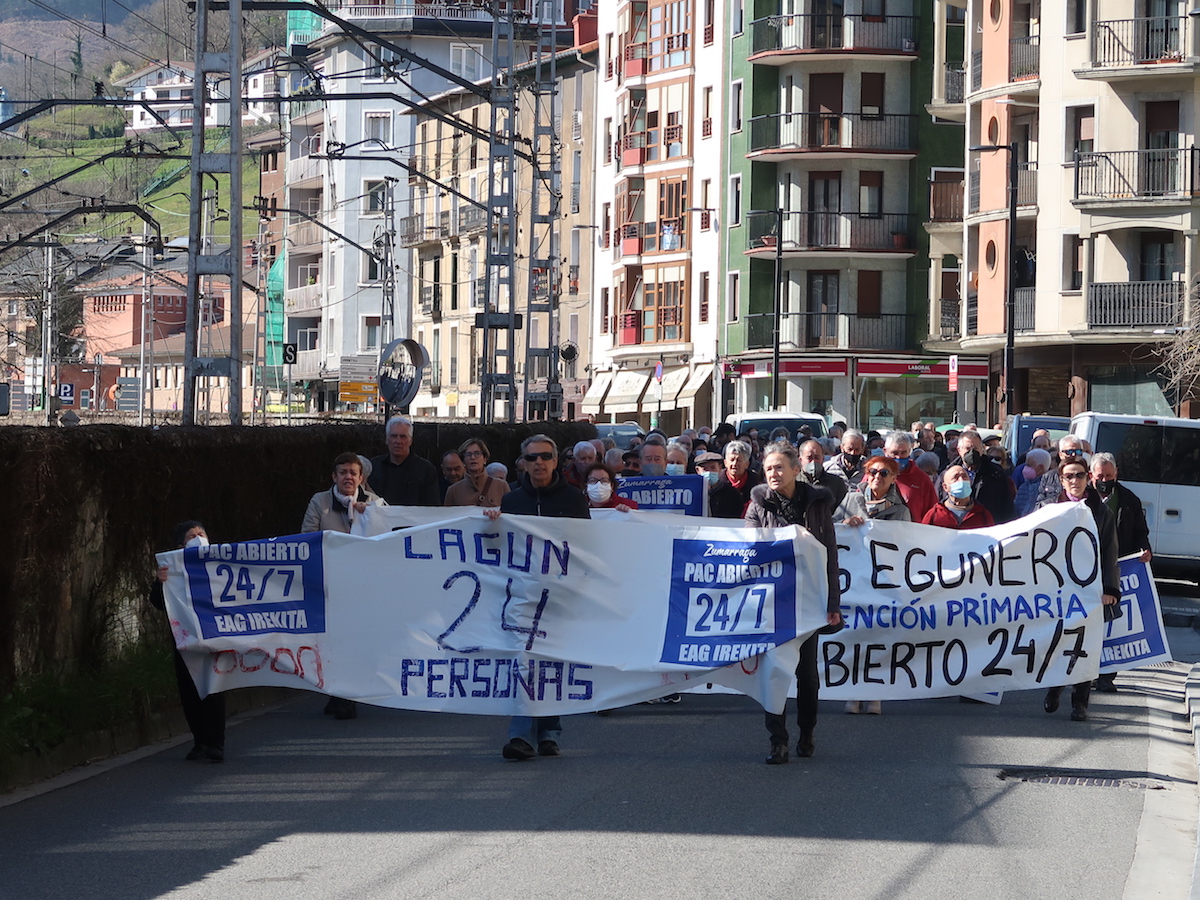 Zumarragako anbulatorioko Etengabeko Arreta Gunea egunero eta eguneko 24 orduetan irekitzearen aldeko manifestazioa egin dute gaur, 24/7 plataformak deituta. Areizaga-Kalebarren plazatik abiatu da protesta, Labeaga kalea alderik alde igaro, Zumarragan sartu eta Secundino Esnaola zeharkatuta, manifestazioa hasi den puntuan bukatu da. Amaieran, EAG-ko zerbitzua zabaltzearen aldeko aldarriak egin dituzte.
