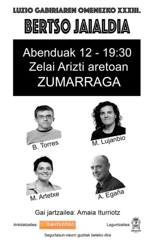 - Bertsolariak: Beñat Torres, Maialen Lujanbio, Miren Artetxe eta Andoni Egaña
